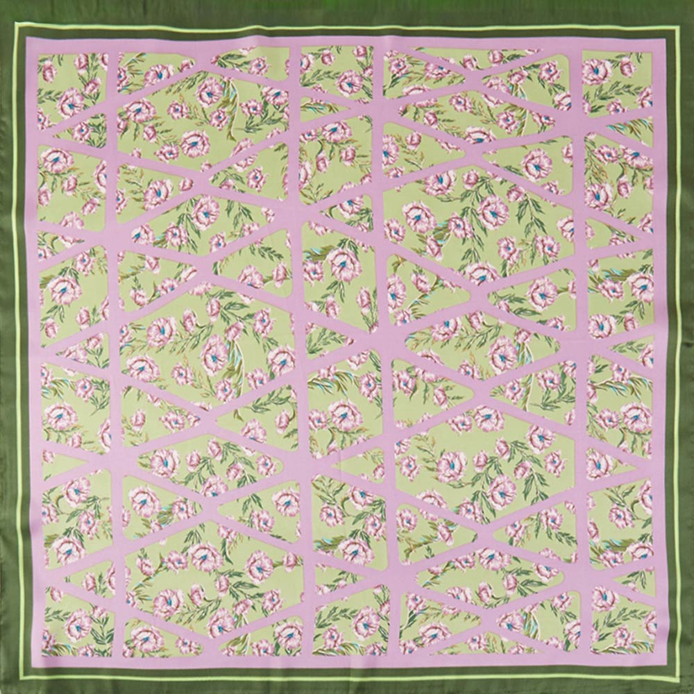 Geometric Floral Pink & Green Pattern Printed Square Silky Bandana Scarf. Flower and leaf theme. Size: 27.5” X 27.5”