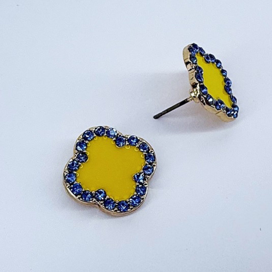 Yellow clover with blue rhinestones earrings, with silver finishing.